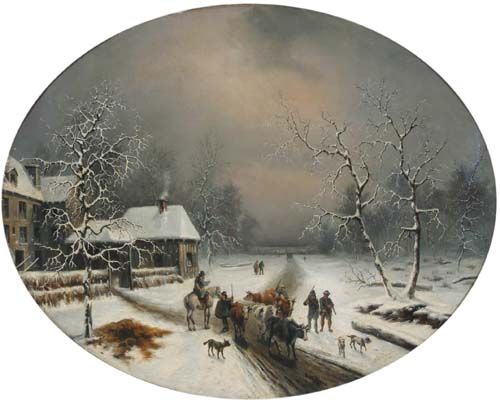 | Winterliche Landschaft mit Gehöft und reichlich Figurenstaffage, im Hintergrund Blick auf ein Dorf | |