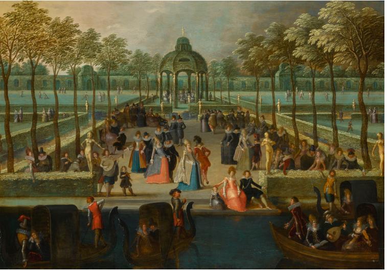 | ELEGANTLY-DRESSED FIGURES PROMENADING IN A GARDEN AND RIDING IN GONDOLAS, SERENADED BY MUSICIANS | |