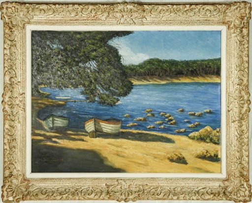 | Weite Meeresbucht. Im Schatten einer Kiefer liegen zwei Fischerboote am Strand | |