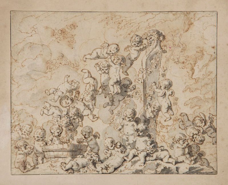 | Putti playing with grapes and decorating an armless bust of bacchus | |