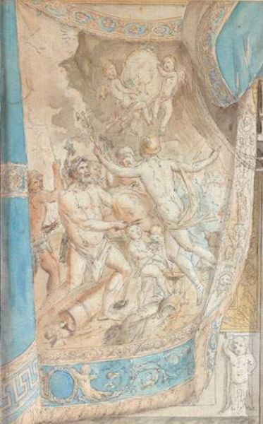 | Vulcain présentant à Mercure un bouclier orné de fleurs de lys, trompe l'œil | |