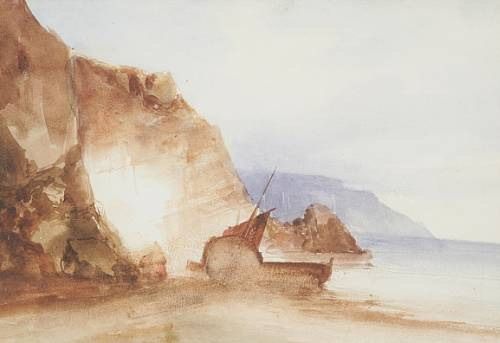 A boat on a seashore line by cliffs