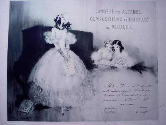 | Certificat de réception à la Société des auteurs, compositeurs et éditeurs de musique. [Élégantes donnant un récital]. 1934. | |