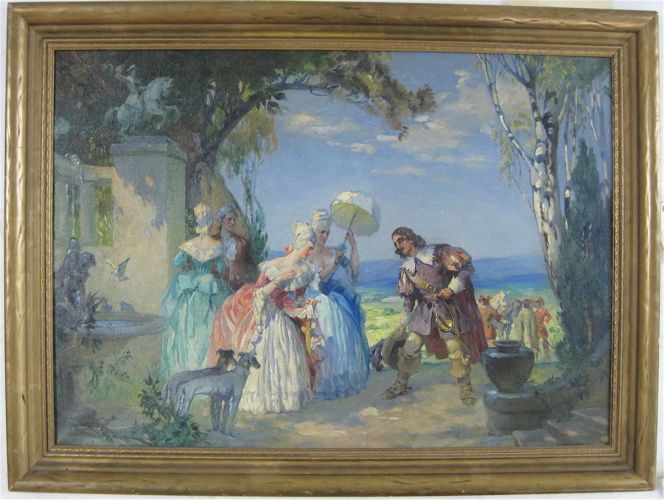 | French garden landscape with musketeer greeting two ladies | |