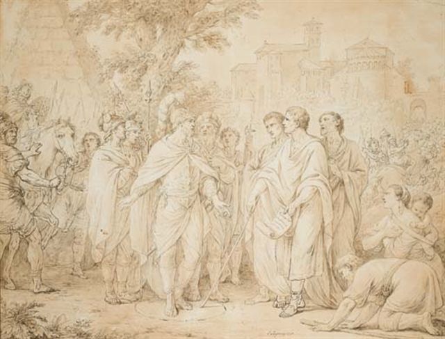| Le consul Popilius Lenas entourant d'un cercle le roi Antiochus | |