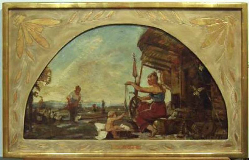 Spinnande kvinna utanför hus. Halvmåneformad ramöppning