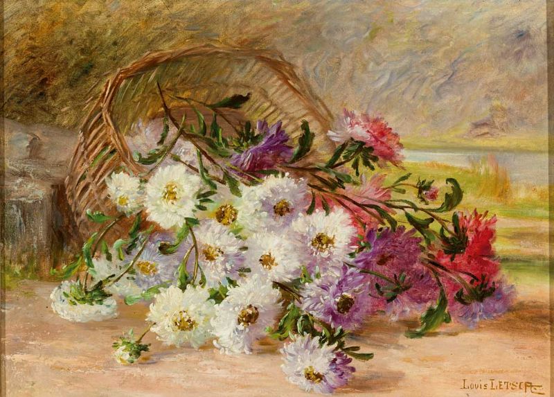 Blumenstilleben mit Dahlien vor weiter hügeliger Landschaft