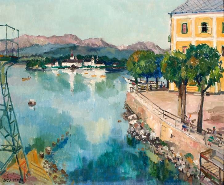 Figuren op de kade aan een bergmeer, mogelijk in Zwitserland