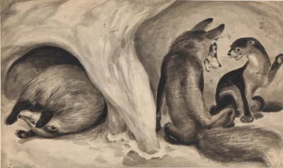 A fox and a weasel watching each other, while a badger is playing