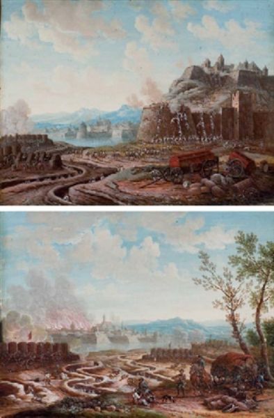 | La prise d'une citadelle; et Soldats au repos devant les tranchées, une ville en feu à l'arrière-plan | |