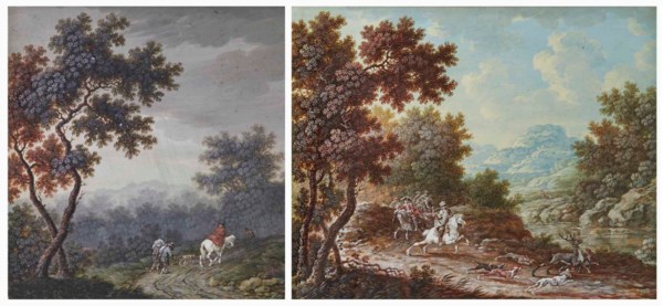 | Paysans avec chien et homme à cheval dans un paysage pluvieux ; et Chasse au cerf | |
