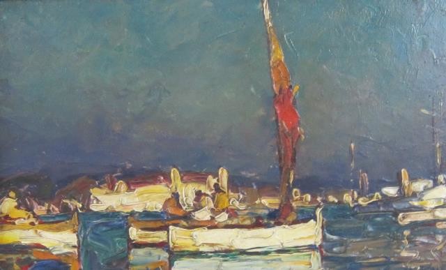 Dutch coastal scene with sailing barges at sunset and with old ink