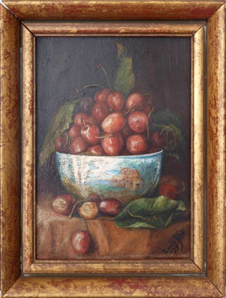Cherries in a painted porcelain bowl