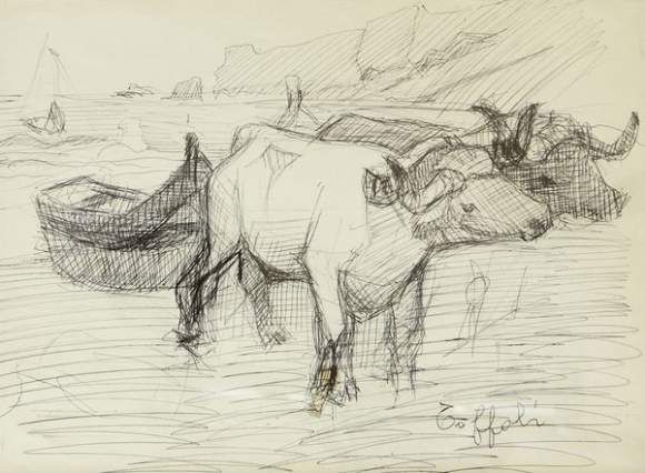 Les bœufs près d'une barque