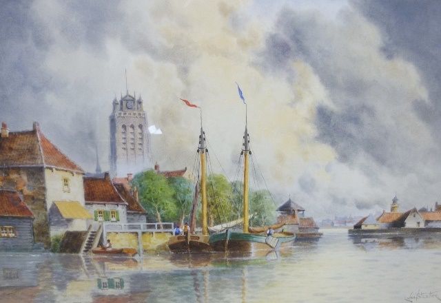 | Dortrect, a canal/estuary view with figures in moored sailing barges, quayside buildings and background church | |