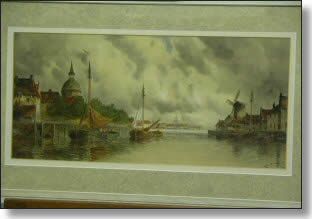 Dutch harbour scenes, with moored vessels dwellings and windmills