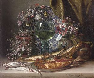 | Fish on a platter, vases of summer blooms, a goblet of wine before a salver and a drape | |