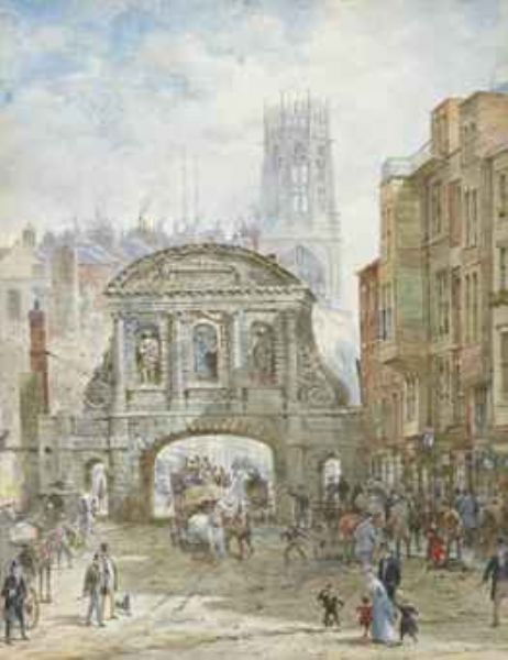 | Horse-drawn carriages and figures before Temple Bar, London | |