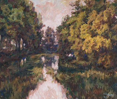 | In impressionistisch-expressivem Duktus gearbeitete Kanallandschaft in romantischer Abendstimmung. | |