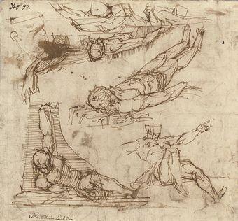 | Studies of foreshortened male nudes (recto); Figures leaning on steps and a Lamentation (verso) | |