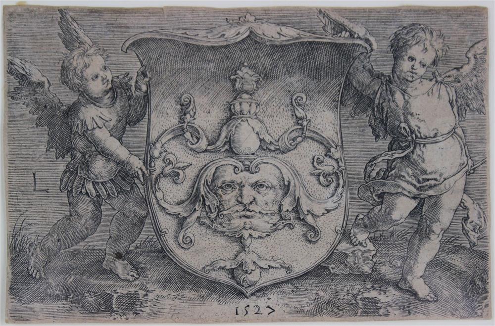 PUTTI HOLDING UP A COAT OF ARMS WITH A MASK, 1527