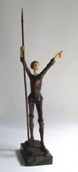 | Don Quixote having ivory color face and hands in a knightly pose holding a long spear | |