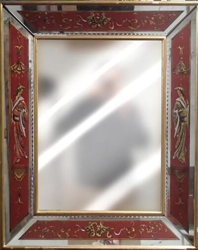 | Miroir rectangulaire à encadrement en miroir églomisé à fond rouge à décors japonisants | |