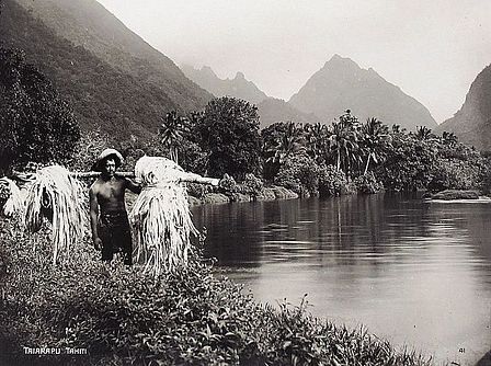 | TAHITIENS EN COSTUMES PRIMITIFS, TAHITIEN AU BORD DU TAIRAPU, TE MAU NEI, UPAUPA MAISON TAHITIENNE. | |