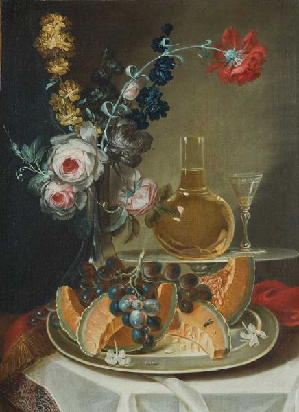 | Piatto con frutta, fiori in un vaso e vino bianco in una caraffa di vetro | |