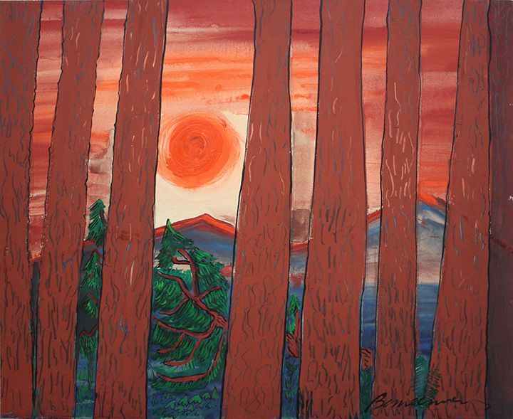 | Forest scene with tree trunks and setting sun. | |