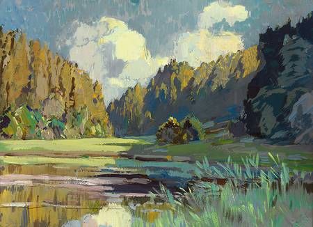| Spiegelnder Teich im sonnigen Licht mit Waldhintergrund. | |