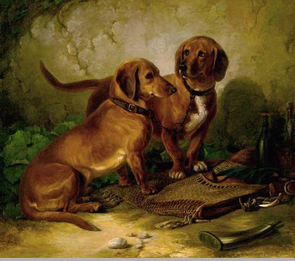 Dackelpaar vor Jagdutensilien und Weinflaschen