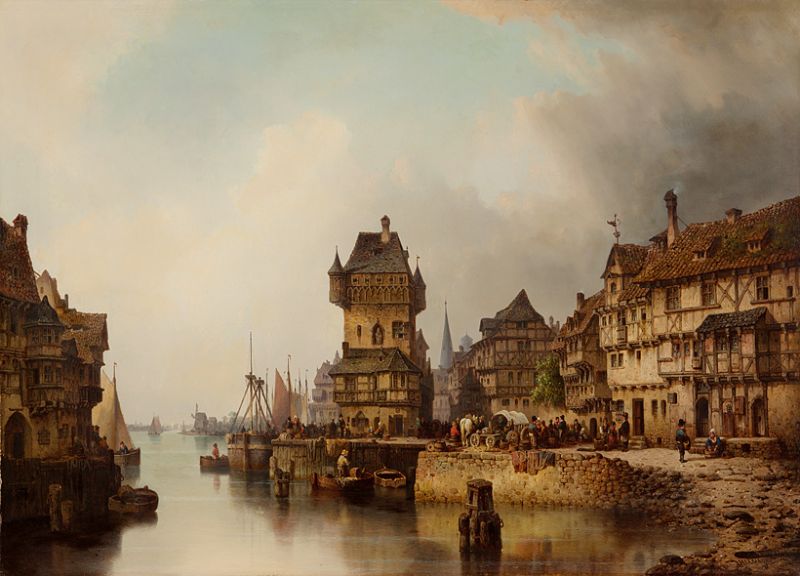 | Holländische Hafenstadt an Flußmündung mit gotischem Turm und Fachwerkhäusern. Am Pier reges Markttreiben mit Händlern und Fraue | |