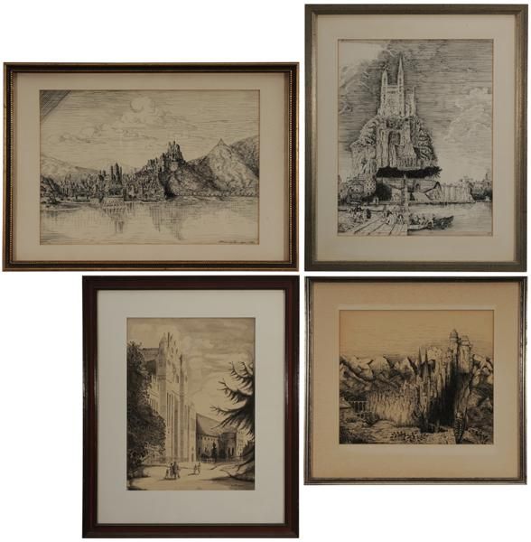 | Group of four pen and ink drawings of landscapes with architecture | |