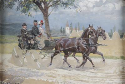 | Kutschenfahrt (Rittmeister v. Buffa und Frau Matissa mit Diener Josef bei einer Ausfahrt im Raume Enns, im Hintergrund die Kirch | |