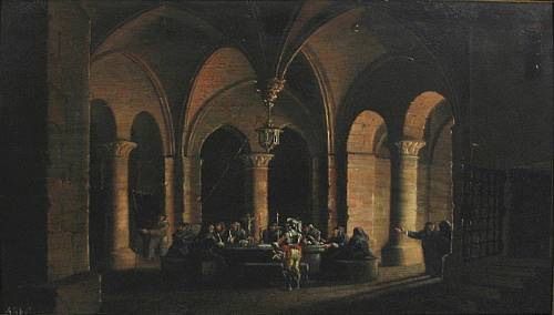 An interior chamber scene with figures at a round table