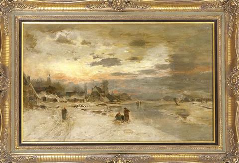 | Düsseldorfer Maler, verschneite Winterlandschaft mit Dorf am Niederrhein im Abendlicht | |