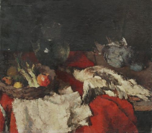 Stilleben mit Ente, Taube und Glaskrug.