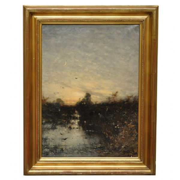 Motiv av landskap i skymning med avtagande halvmåne, fåglar, skog, människor och vattendrag.