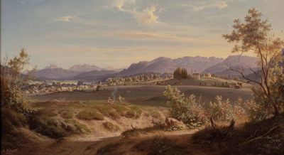Kleinstadt mit Hirten in einer Voralpenlandschaft