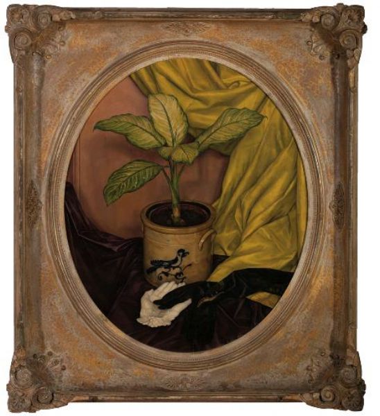STILL-LIFE WITH STONEWARE CROCK, BLACK GLOVES, AND WHITE MARBLE HAND