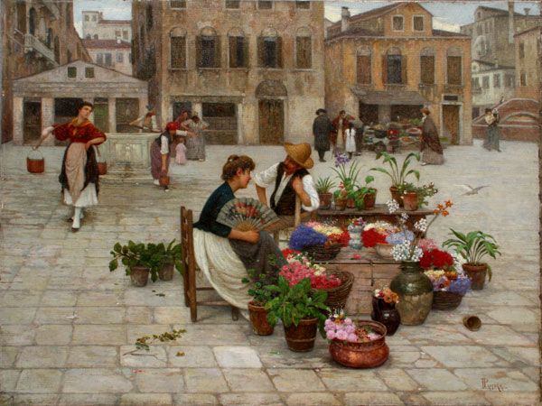 Courtyard Scene with Flower Sellers And Figures