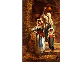 | ZWEI JUNGE ITALIENISCHE FRAUEN MIT KUPFERGEFÄSSEN BEIM WASSERHOLEN IN BEGLEITUNG EINES KLEINEN MÄDCHENS | |
