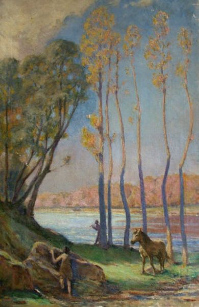 Mythical scene in a wooded landscape