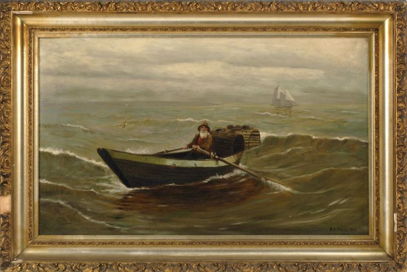 A fisherman at sea in a dory loaded with traps