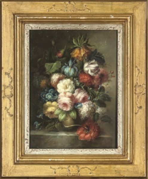 | Iris, roses, parrot tulip and morning glories in a vase, on a marble ledge; and Parrot tulip, corn flowers, hollyhocks and chrys | |