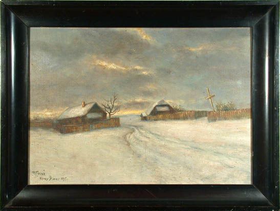 Winterliche Ansicht eines russischen Dorfes unter wolkenverhangenem Himmel