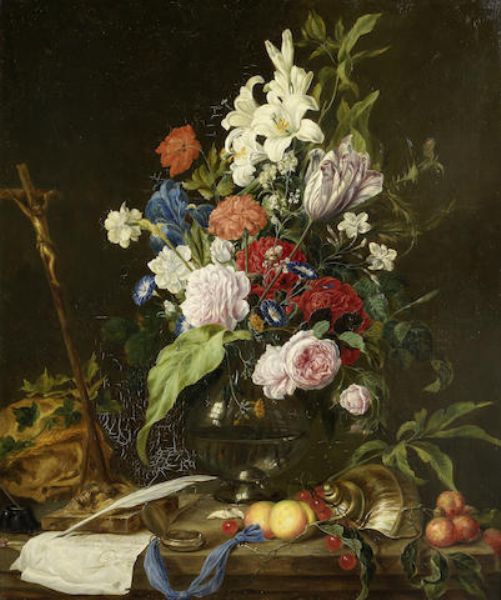 Flowers in a glass vase on a ledge, with a crucifix, a watch, a shell and other items on a marble ledge
