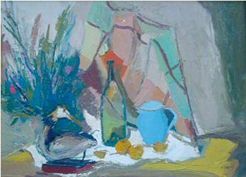 Oiseau, bouquet de fleurs et pichet bleu sur une table