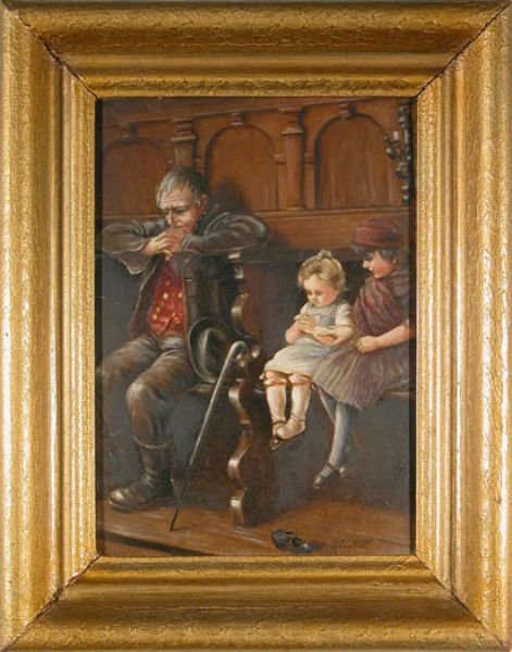 | Bäuerliche Familie im Chorgestühl einer barocken Kirche. Nach einem Original von Kaulbach. | |